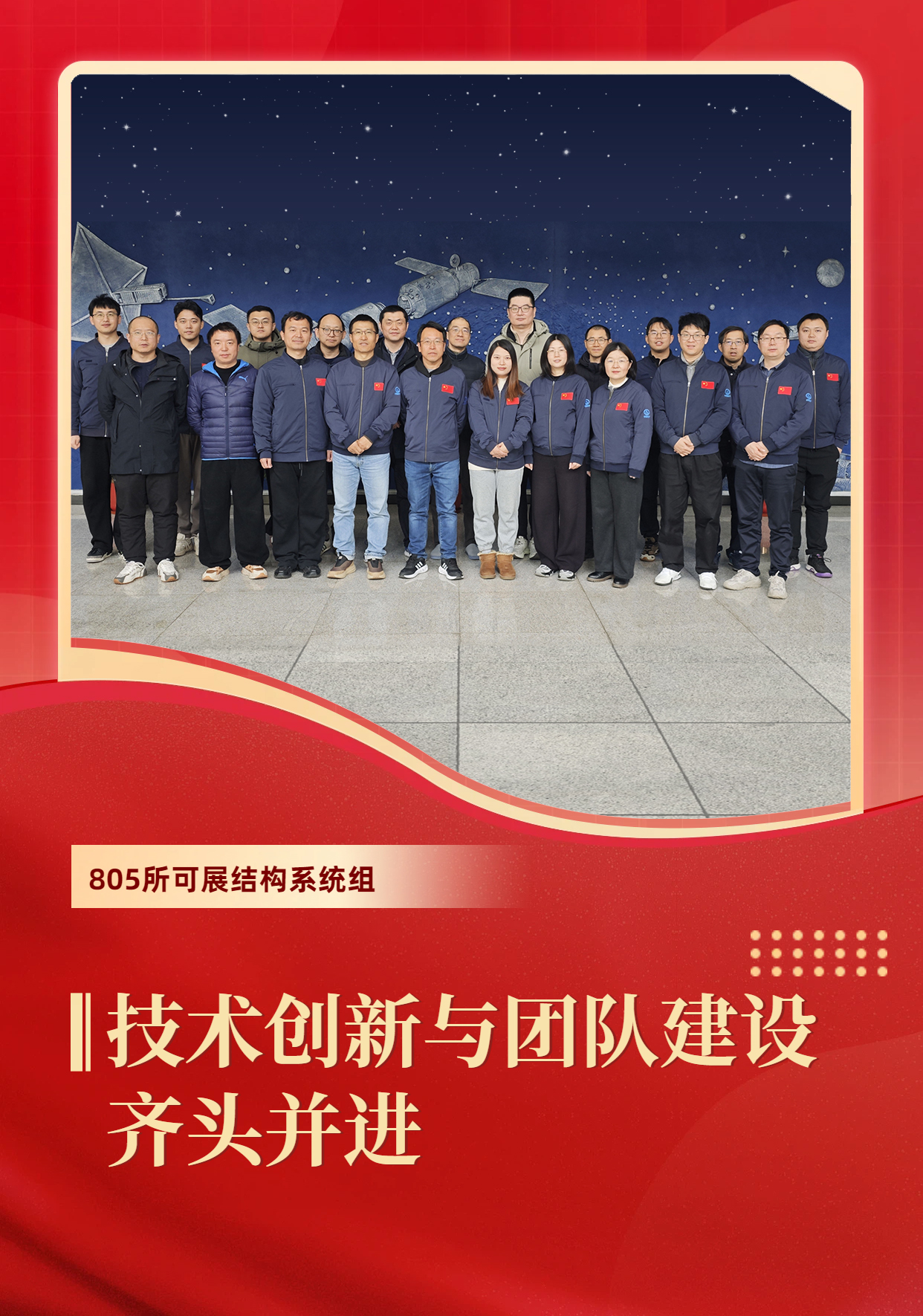 805所可展结构系统组主要从事太阳翼、天线、薄膜、新型载荷机构等产品研制工作,业务覆盖载人航天、深空探测、卫星工程等领域,班组精研实干、守正创新,形成了“凝心、建芯、迎新”的特色文化。