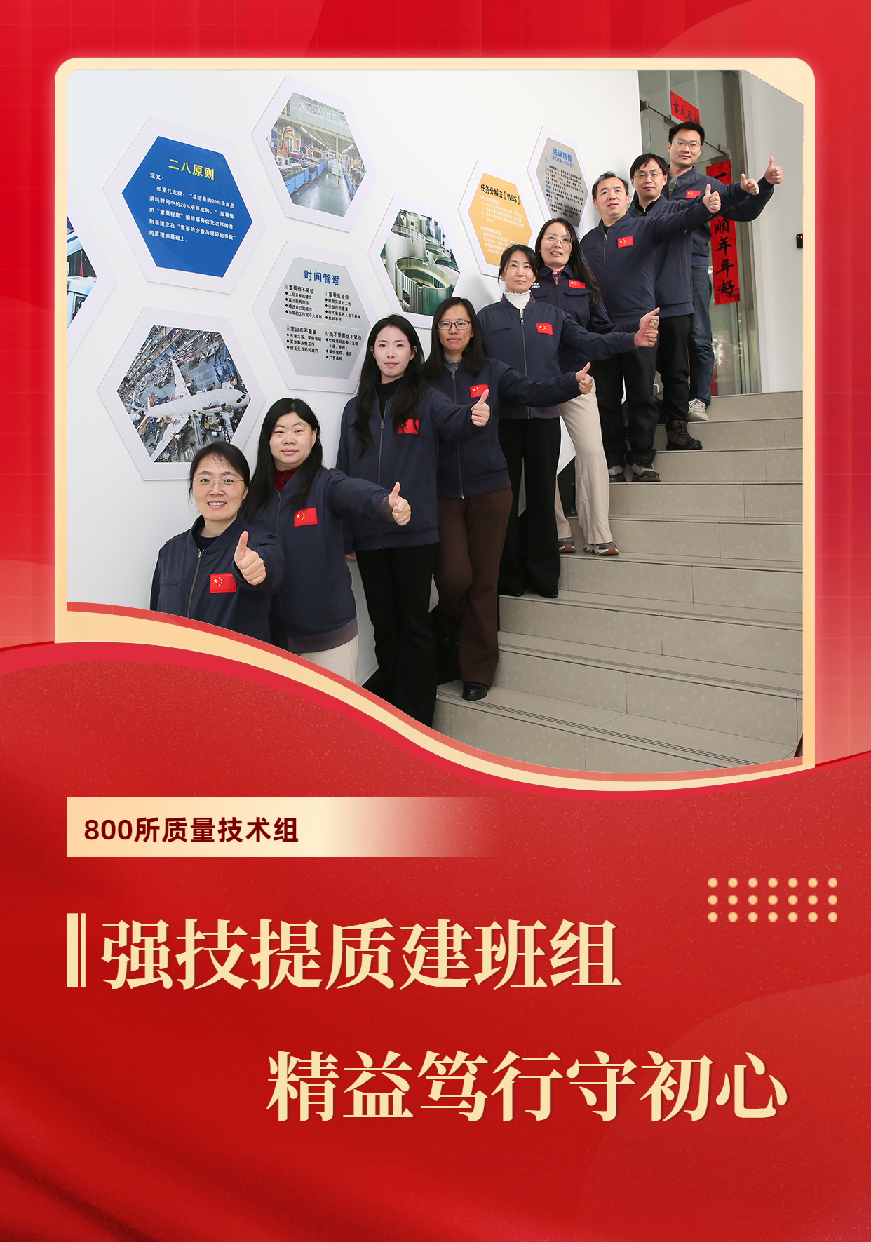 800所质量技术组主要承担质量管理体系建设、精益管理、检验技术研究等业务。班组深植“'啄木鸟'精准施治、守正精进”的文化内核,锚定质量标杆,驱动管理升级,以“师者”“医者”“警察”三重角色,实现了从“事务性班组”到“自驱动团队”的转变。